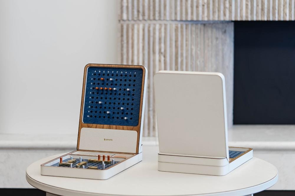 Elsewhere, the show oscillates toward material experiment: a Carrom table by Vismara Design, Gianfranco Frattini’s steel chess set, Valeria Molinari’s woven Backgammon carpet, Pinetti’s Battaglia navale (Battleship) in leather and wood (see photo), Pineider’s Gioco dell’oca (Game of the Goose). Spartaco Albertarelli’s La scrivania del game designer, paired with cabinetmaker Pierluigi Ghianda’s desk, literalises the bridge between imagination and fabrication — the space where ludic thought meets its material double. The path concludes with memorIA, an AI-driven game by Studiolabo and Silvia Badalotti, and a playable ludoteca — a simple but necessary closure, since games, after all, exist only in play.