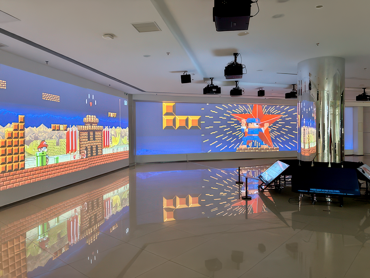 A focal point for many visitors is Feng Mengbo’s Long March: Restart (2008), a large-scale interactive videogame installation that reworks the visual grammar of side-scrolling action titles into a politically charged, historically referential format.