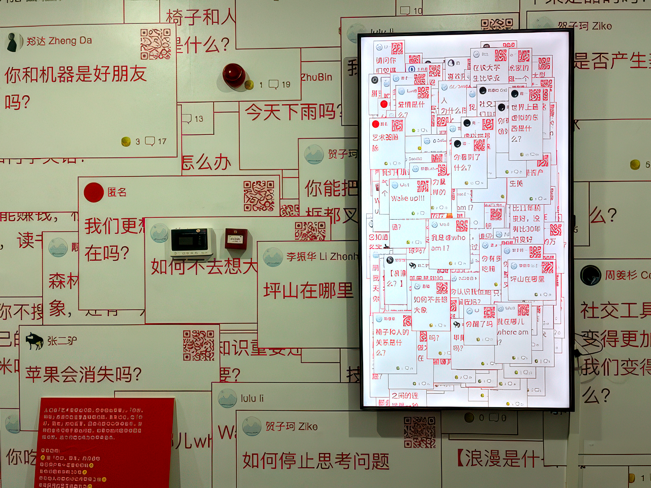 A focal point for many visitors is Feng Mengbo’s Long March: Restart (2008), a large-scale interactive videogame installation that reworks the visual grammar of side-scrolling action titles into a politically charged, historically referential format.