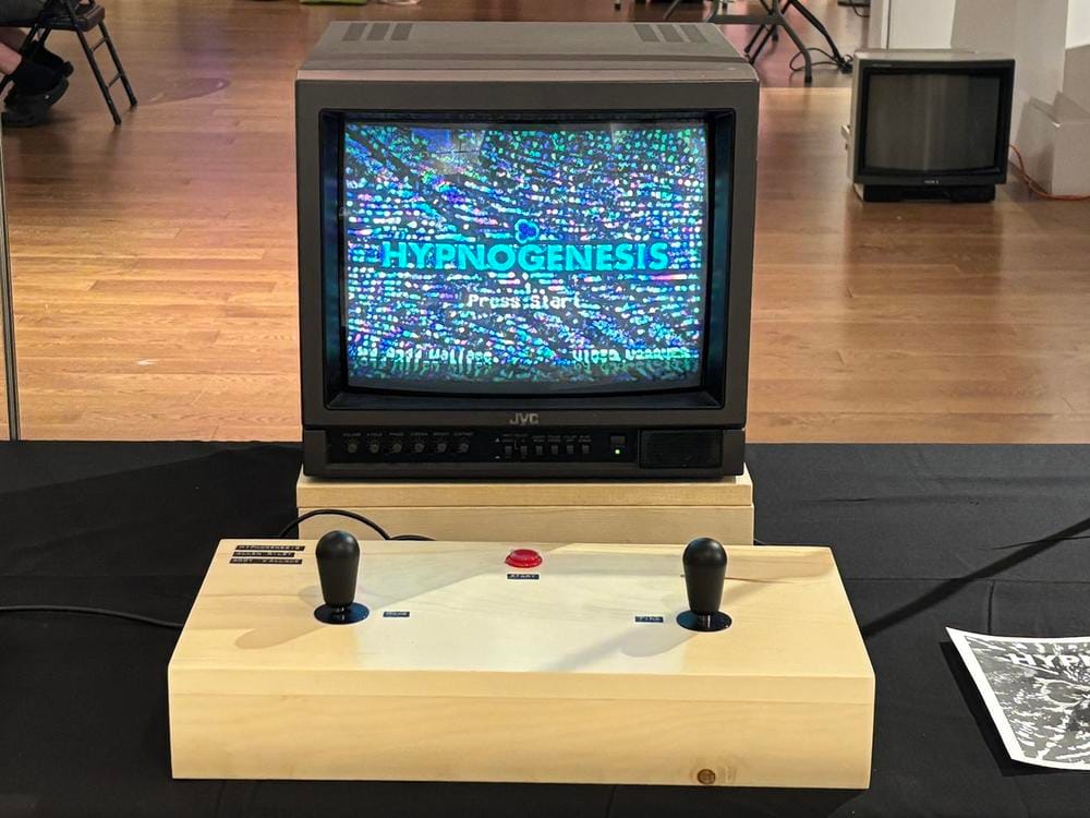 The more persuasive works did not oppose critique to play. Rather, they made play itself the vehicle of critique. Allen Riley and Andy Wallace’s Hypnogenesis — a video feedback space shooter in which arcade gameplay was integrated with the controls of a video synthesizer — had the blunt legibility of a cabinet, but its force lies in the way it collapses cabinet, instrument, and display into one feedback apparatus. in the way it collapsed authorship, display technology, and input into a single unstable loop. The player was not mastering a system so much as entering a volatile circuit in which the boundary between controller and instrument refused to stabilise. In the context of a GDC week show, the arcade cabinet carried additional pathos: it is the form that preceded the industry entirely, before platforms, before storefronts, before the very infrastructure the so-called festival of gaming exists to service.
