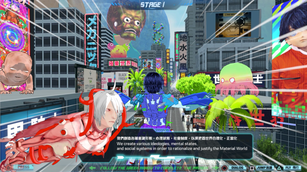 At the centre of the piece is the androgynous avatar Material World Knight, who journeys through cycles of conflict, transformation, and renewal that echo samsara—the ceaseless rhythm of birth, death, and rebirth. Visitors can encounter the work in two formats: as a projected single-channel film or as the interactive The Great Adventure of Material World–Game Film (2020). In the latter, players guide Material World Knight through six planes of the bardo, the transitional state between death and rebirth, confronting trials that question attachment, desire, and the illusion of selfhood. Populated by characters and motifs from Lu Yang’s earlier works (2011–2019), the project eschews conventional progression and reward, instead staging cycles of destruction and renewal.