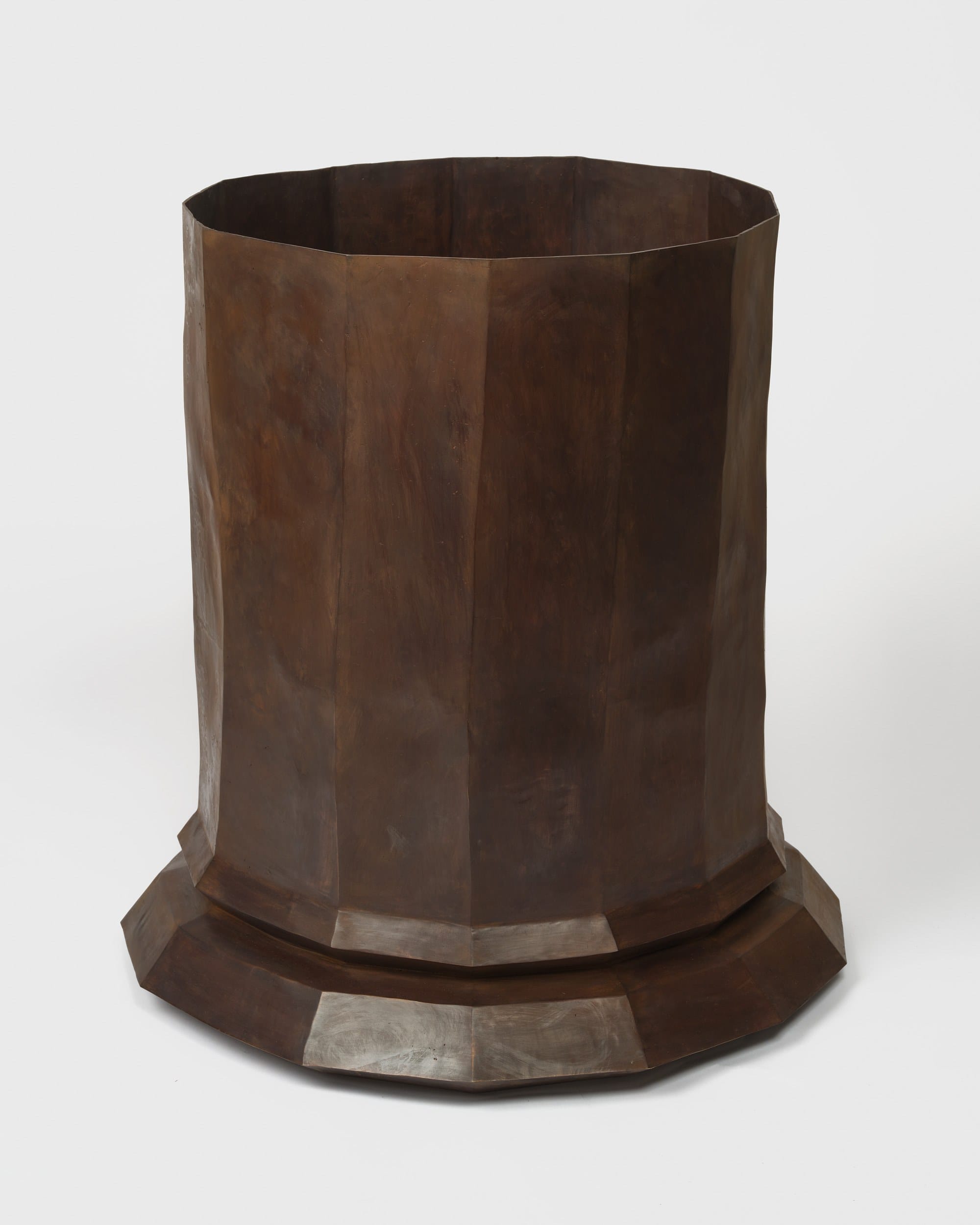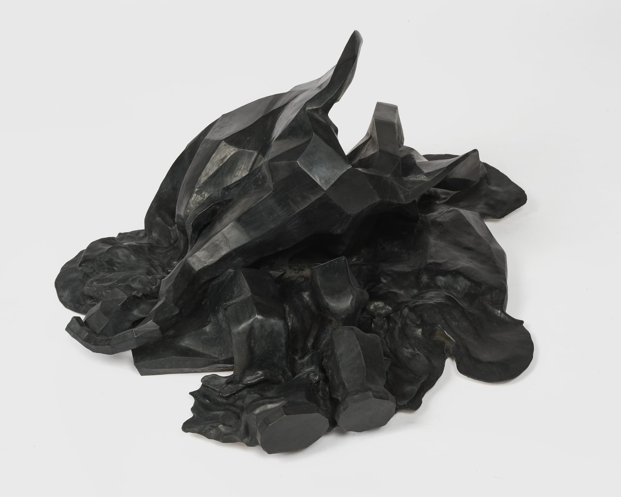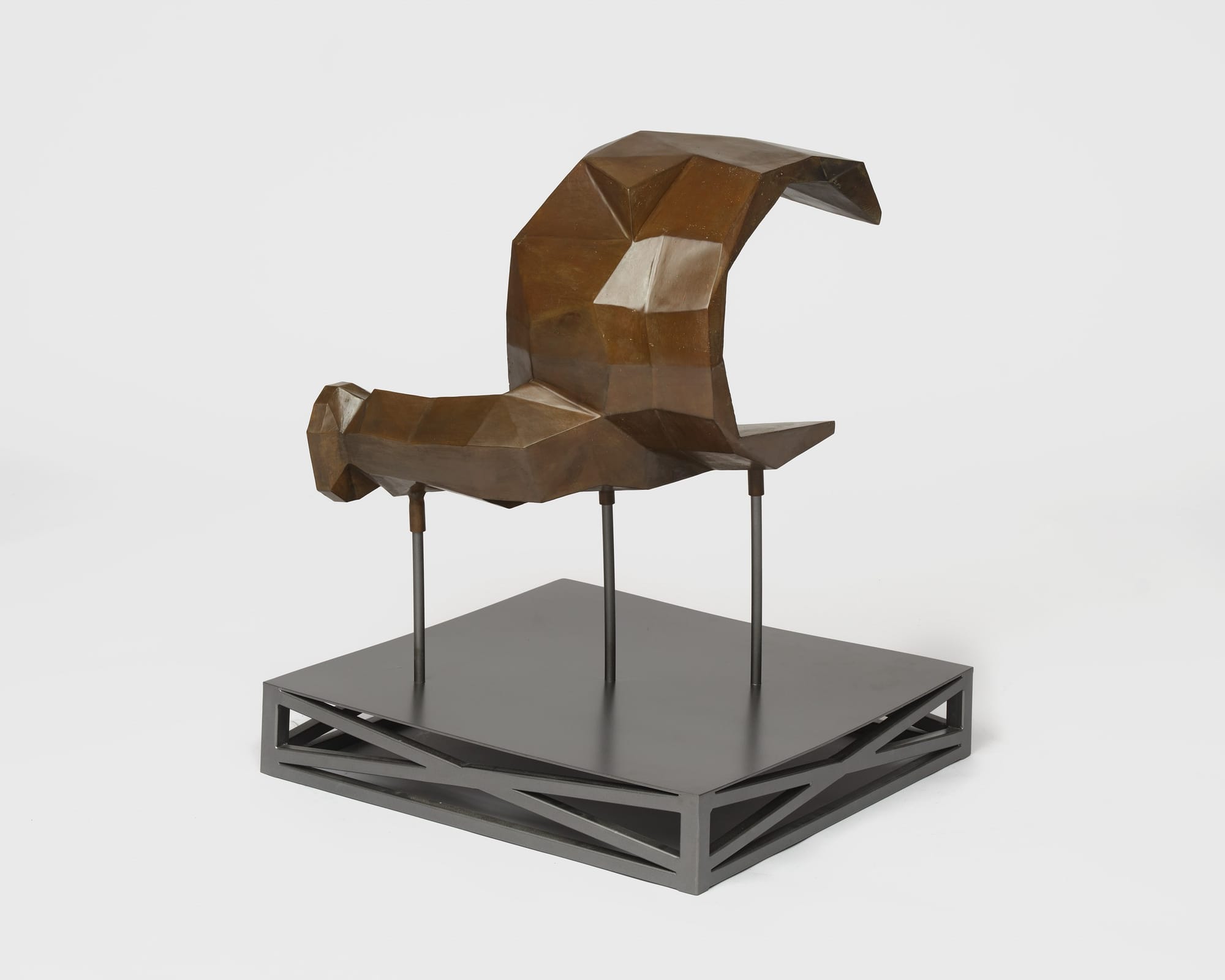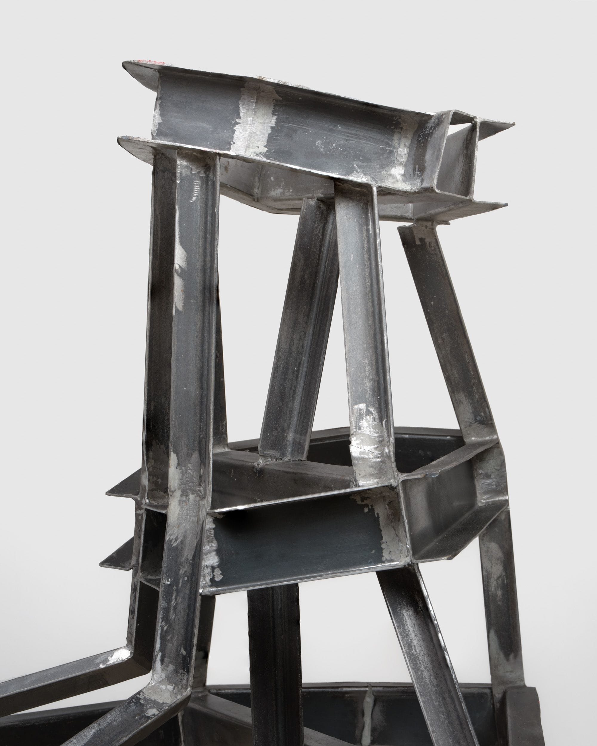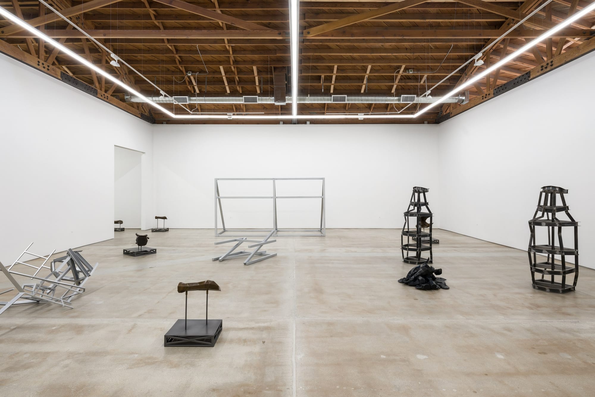 The gallery was populated by hybrid structures in bronze and steel: ghosts of elephants, colonnades, and scaffolding from Griffith’s original film set. These forms had been pulled apart, their completeness denied. Some works appeared to erode into the floor or collapse into abstract shapes, while others stood on thin supports or were dismantled into flattened fragments. One piece included a distorted elephant reduced to geometric masses, barely traceable by a contorted feature or outline. The sculptures emerged from 3D modeling processes that referenced not just L.A. Noire’s digital Babylon, but also the faux-ancient recreations built around Hollywood in recent decades, most of which have since been demolished. Dean synthesized these references into minimalist skeletal structures and heavy cast forms, stripping them to their essential silhouettes. Her figures were often reduced to frameworks that suggested architectural support systems now lacking anything to uphold. Several of the twisted steel works seemed caught mid-collapse, as if the gallery itself had been overrun by the wreckage of history’s theatrical ambitions. The space resembled an excavation site for an entirely fictional civilization: an archaeological dig of something that was never really there to begin with.