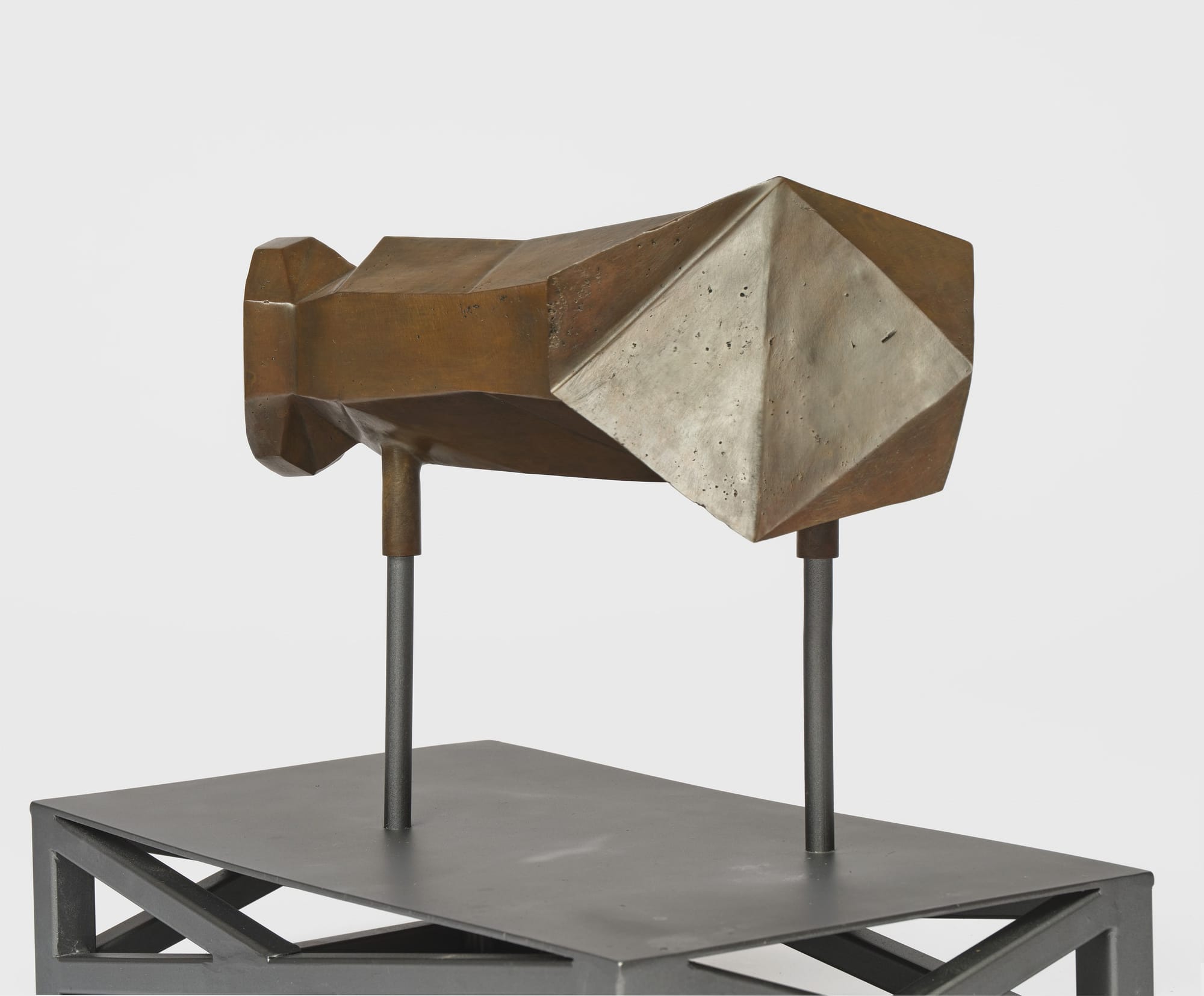 One prominent sculpture, comprised of misaligned bronze and steel elements, was based on a combination of Griffith’s original design and its digital recreation within L.A. Noire. Dean’s method of translating that in-game environment into a tangible sculpture foregrounds the absurdity of origin: a physical copy generated from a virtual replica of a cinematic set modeled after an imagined ancient past. This process typifies the condition often described as post-cinematic, where representations circulate without clear beginnings, operating freely between material and digital domains. Dean neither conceals the limitations of the source material nor smooths its translation. The low-resolution geometry typical of video game environments remains visible in the surfaces of her casts, and the perspectival distortions introduced by the game’s camera persist in the warped forms. These distortions are deliberately preserved, embedding traces of digital authorship within the object’s physical structure. Her work invites reflection on how reality is shaped through layers of mediation, each with its own distortions and omissions.