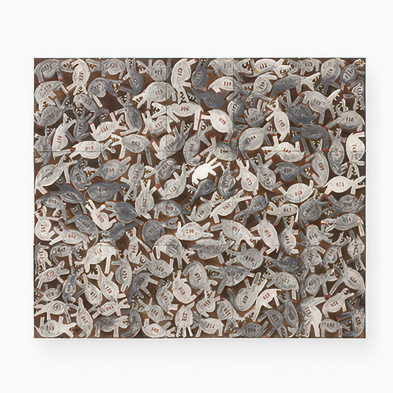 At the same time, the tactility of Restrepo’s materials resists the clean, frictionless surface of the screen. The brushstrokes in the black background, the slightly misaligned grids, the seams of tape, visible in reproduction as well, disturb any nostalgic reading. Instead of celebrating the arcade as a harmless retro icon, Space invaders 1 suggests how easily its visual language can be retooled to narrate state violence, militarised conservation and the quantification of life.