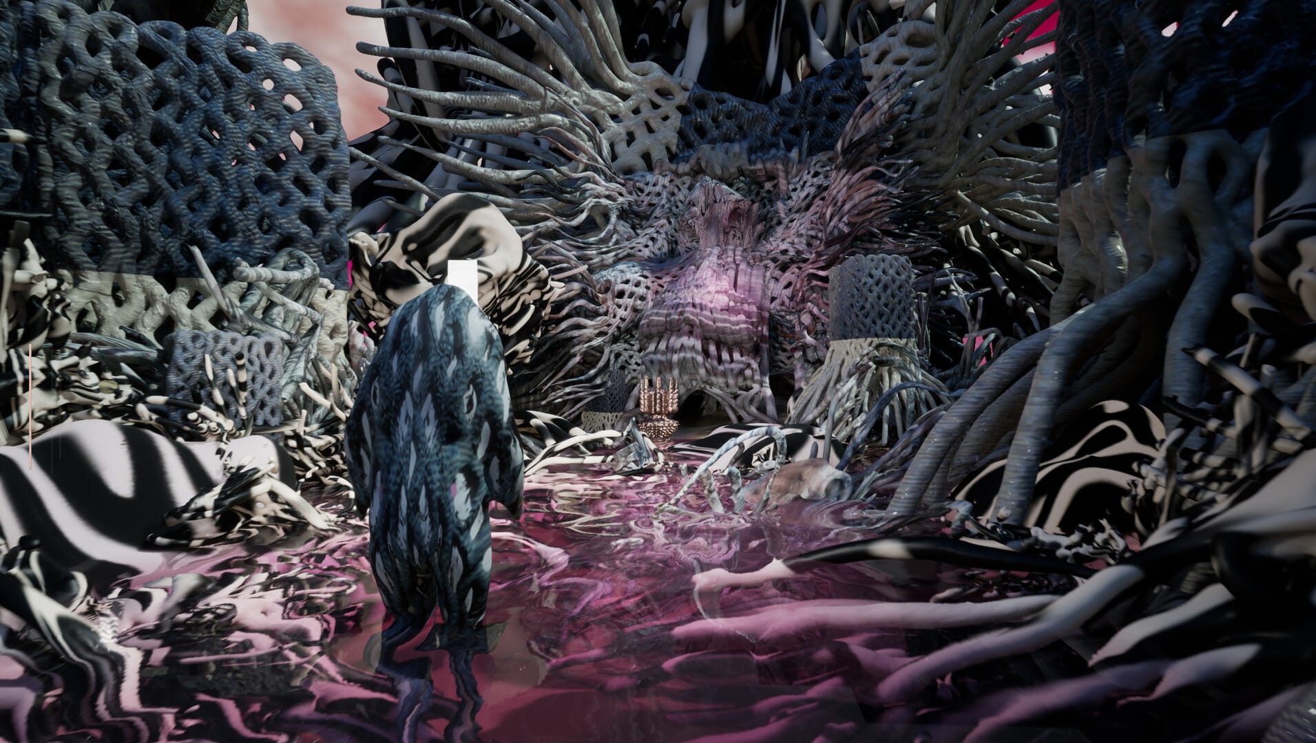 Castañeda (b. 1988, Cali, Colombia) describes the broader Camoflux project as a hand-painted, episodic exploration game concerned with environments where bodies, landscapes, and technology fuse, and where camouflage and environmental energy transform the terms of conflict. He frames this through a phrase of his own coinage — “third-person ontology” — by which the conventional third-person perspective becomes a vehicle for treating world-formation as philosophical proposition rather than genre convention. Whether one finds that rhetorical scaffolding persuasive or overdetermined, it clarifies what the Whitney is actually exhibiting: not a game seeking art’s legitimizing frame, but a project conceived from the outset to treat painting, 3D modeling, and game engine work as co-equal forms of making.