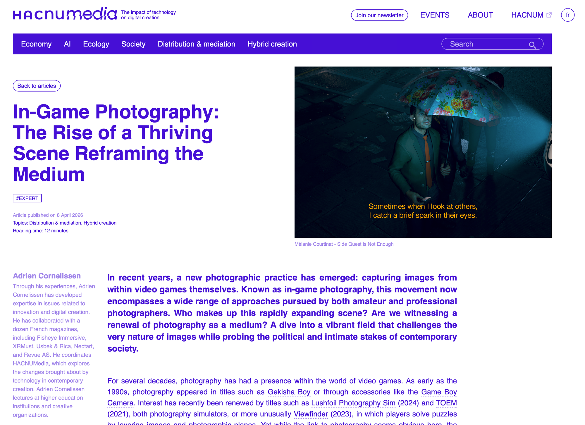 Adrien Cornelissen has written a comprehensive and detailed overview of in-game photography for HACnumedia in both English and French.