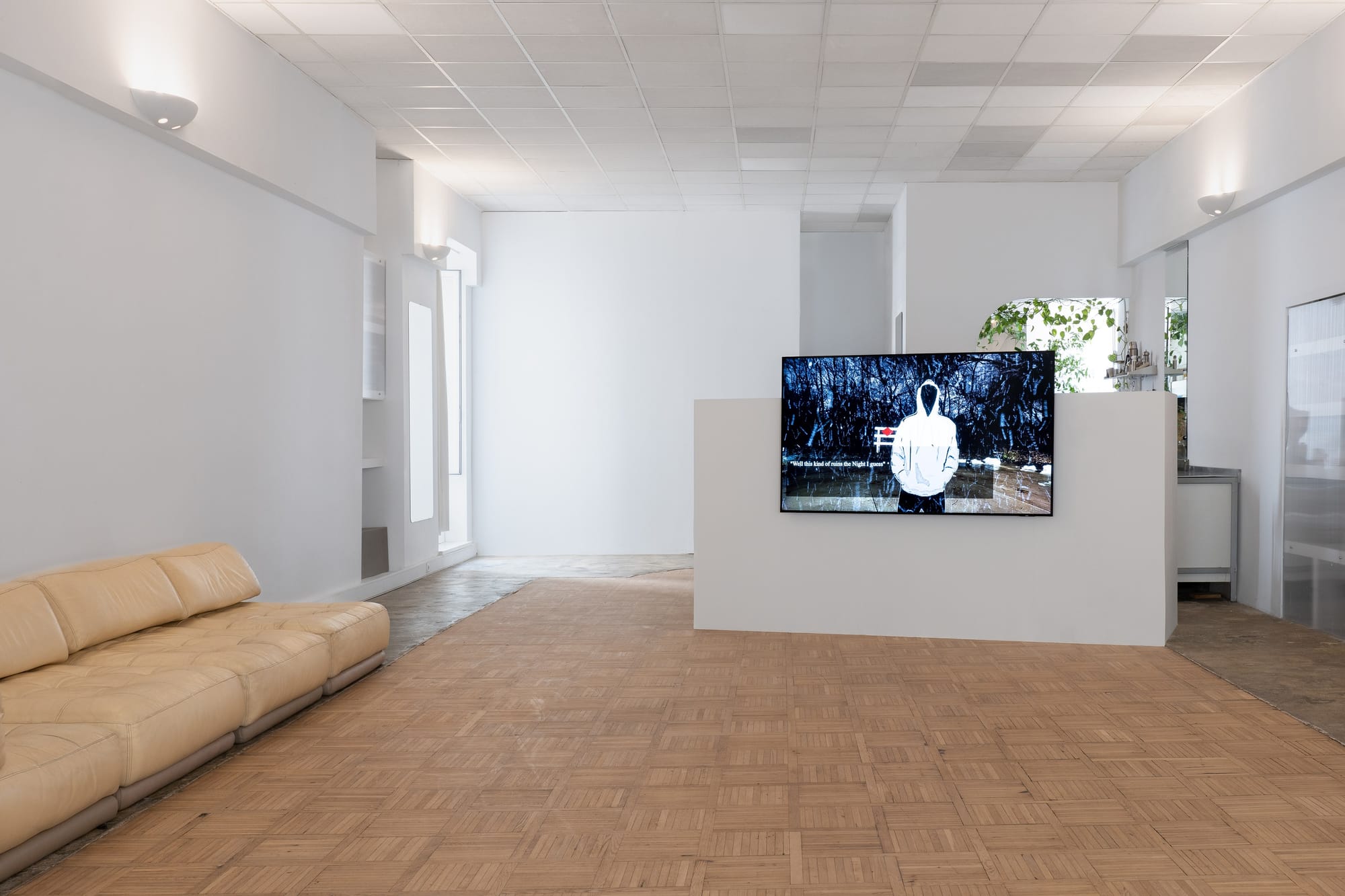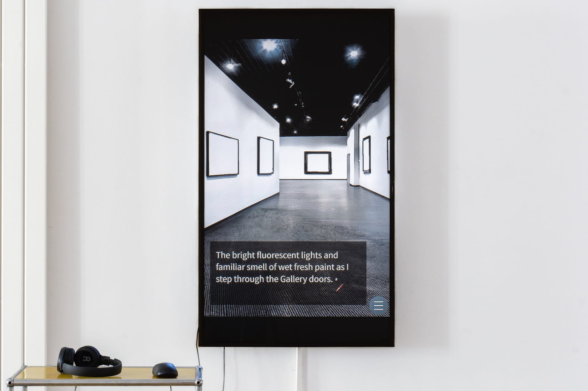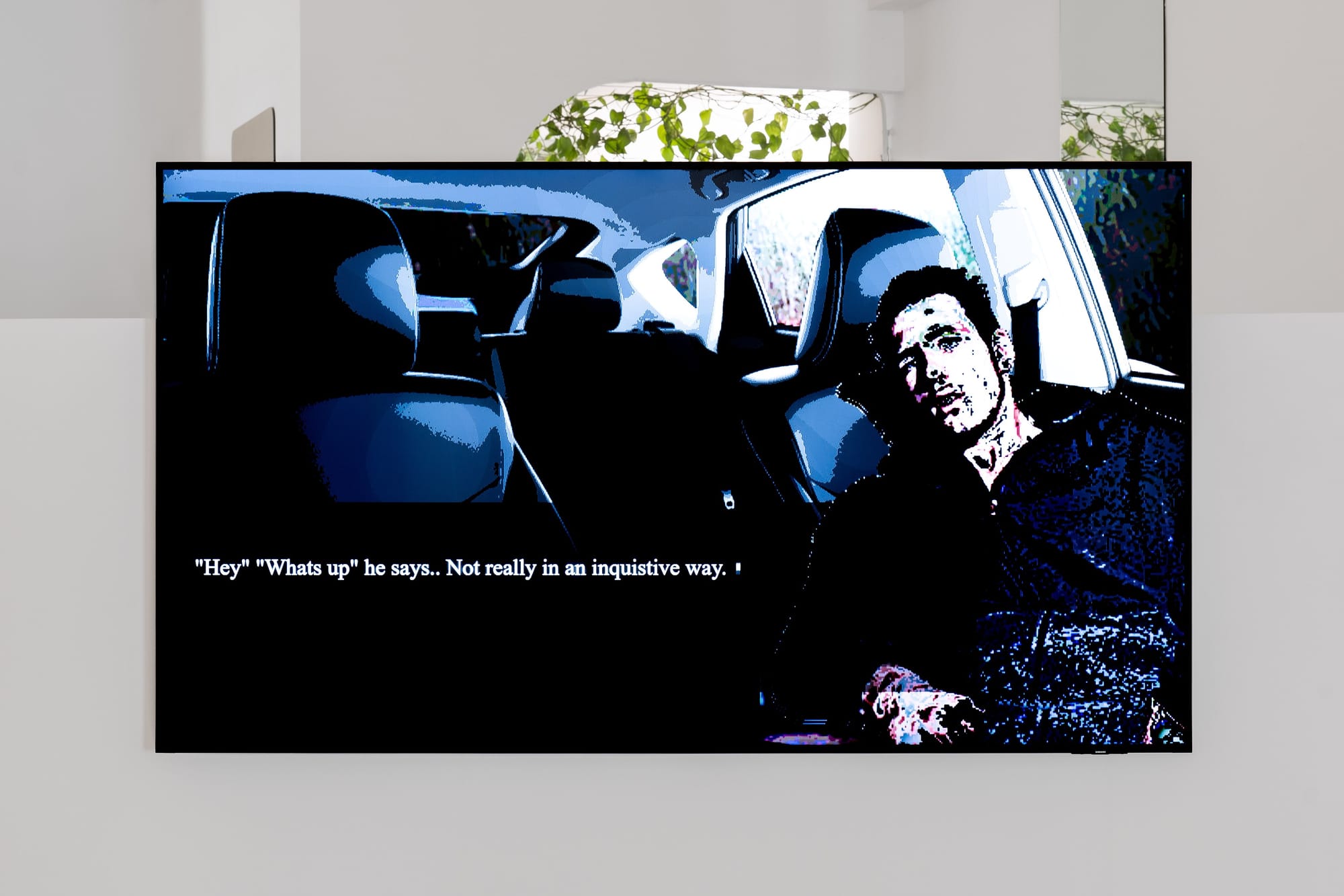 In the gallery, a single luminous screen interrupts an otherwise spare room. The monitor shows digital tableaux that oscillate between cartoon and noir: cropped avatars, shallow spaces, flattened textures, dialogue lines subtitling the image. Instead of the sensory overload associated with mainstream videogames, the pacing is stubbornly methodical. You sit, read, decide, click. The interface is simple, almost ascetic, which makes every small decision – accept, refuse, confess, look away – feel pointed.